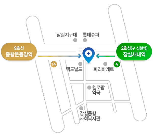- 2호선 이용시, '잠실새내역' 4번 출구에서 종합운동장 방향으로 도보 2분(50m) 직진,