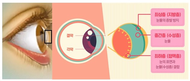 안구건조증의 원인은 눈 속 수분 부족보다는 눈물 성분 비율의 불균형으로 눈물이 빨리 마르는 증발과다형 비율이 2:8일 정도로 훨씬 더 많다. 눈물은 눈물의 증발을 막아주는 바깥 지방질 층과 그 아래 수분층, 제일 안쪽에 위치해 눈물이 고루 퍼지게 해 주는 점액층으로 구성돼 있는데, 이 세 가지 구조 중 한 가지 성분만 부족해도 눈물 성분의 균형이 깨지면서 안구건조증이 쉽게 생긴다. 눈꺼풀염이나 마이봄샘염 등으로 인해 눈물샘에서 윤활유 가름 성분이 잘 분비되지 못하면 눈물층이 일정한 두께를 유지하지 못하고 빨리 마르면서 안구 건조가 발생하는 것이다.